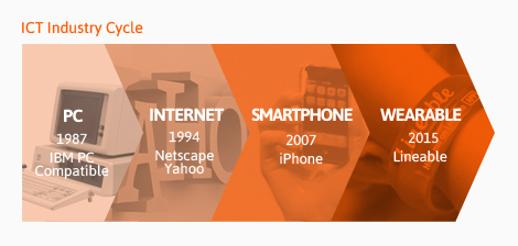 ICT Industry Cycle을 살펴보면 과거 몇 번에 걸쳐 패러다임의 변화가 있었음을 알 수 있다. 그 변곡점에서 새로운 기회가 창출되었고, 그 기회를 잡은 회사들이 크게 성장했다. PC의 경우 IBM, 인터넷에서는 Yahoo가, 스마트폰에서 애플이 그러했다. 그리고 작년부터 웨어러블로 패러다임이 전환되는 추세를 찾아 볼 수있고, 앞으로 큰 기회가 있을 것으로 전망된다. KT경제연구소의 2014 웨어러블 디바이스 산업백서에 따르면 웨어러블 디바이스 시장 규모가 2014년 약 33억 달러에 이어 2017년에는 60억 달러(약 6조원)를 넘어설 전망이라고 한다. 이러한 긍정적인 전망에 따라 많은 기업들이 웨어러블 분야에 집중하고 있으며 많은 스타트업이 설립되어 신규 주자로 참여하고 있는 상황이다.