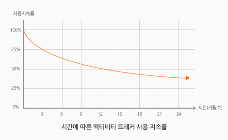 액티비티 트래커는 웨어러블에서 가장 성공한 기업들이 포진하고 있는 분야이다. 그러나, 왼쪽 하단의 시간에 따른 액티비티 트래커 사용 지속률 그래프를 보면 액티비티 트래커를 소유하고 있는 고객 중 절반 이상이 6개월 이내에 사용을 중지하고 있다는 사실을 알 수 있다. 겨우 6개월을 쓰고 버리기엔 액티비티 트래커의 값이 너무 비싸다. 그럼에도 불구하고 사람들이 사용 중지의 결정을 내리는 데에는 이유가 있다.