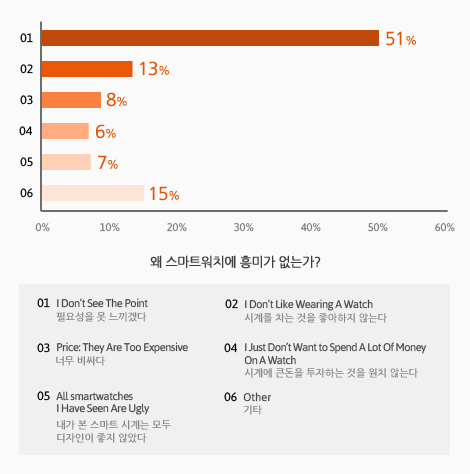 여기 1,326명의 사람들을 대상으로 스마트워치에 대해 왜 흥미가 없는 지에 대해 조사한 결과가 있다. 51%의 사람들이 ‘I don’t see the point’ 라고 답했다. 절반 이상의 사람들이 스마트워치의 필요성을 못 느끼고 있음을 알 수 있다. 액티비티 트래커의 짧은 사용기간의 이유도 마찬가지이다. 그럴싸해 보이는 테크 제품이지만, 실제로는 유용하지 않으며 이를 깨닫는 데에는 단지 몇 개월이 걸렸을 뿐이다.
