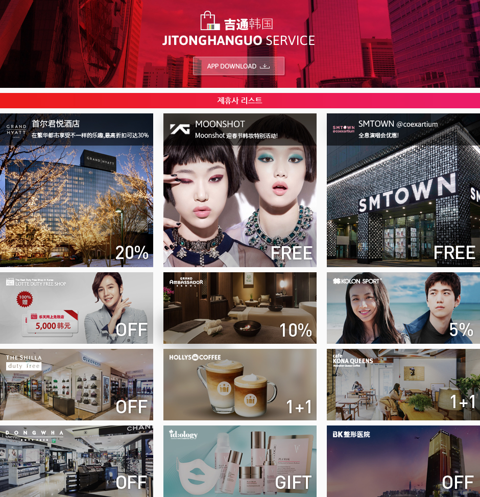 digitalDigm开发的吉通韩国 提供韩国超过7,000个免费WiFi热点和主要名胜地区、主题观光等有用信息的中国游客必备的APP。最近吉通韩国的合作企业超过了30家,以各种各样的打折券和赠券提供更大的优惠。目前吉通韩国的合作企业是如下: