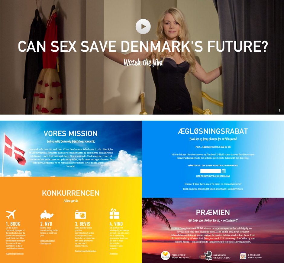 덴마크 여행사 Spies가 'Do It For Denmark' 캠페인을 주최했다. 이 캠페인은 아기를 잉태할 가능성이 있는 여성이 배란기에 맞춰 여행을 가면 여행상품의 가격을 할인해주고, 할인받아 떠난 해외여행에서 사랑을 나누고 돌아온 후 임신했다는 것을 증명하면 아기가 태어난 후 3년까지 아기용품과 가족이 함께 리조트에서 쉴 수 있는 여행 패키지를 경품으로 증정한다는 내용이다.